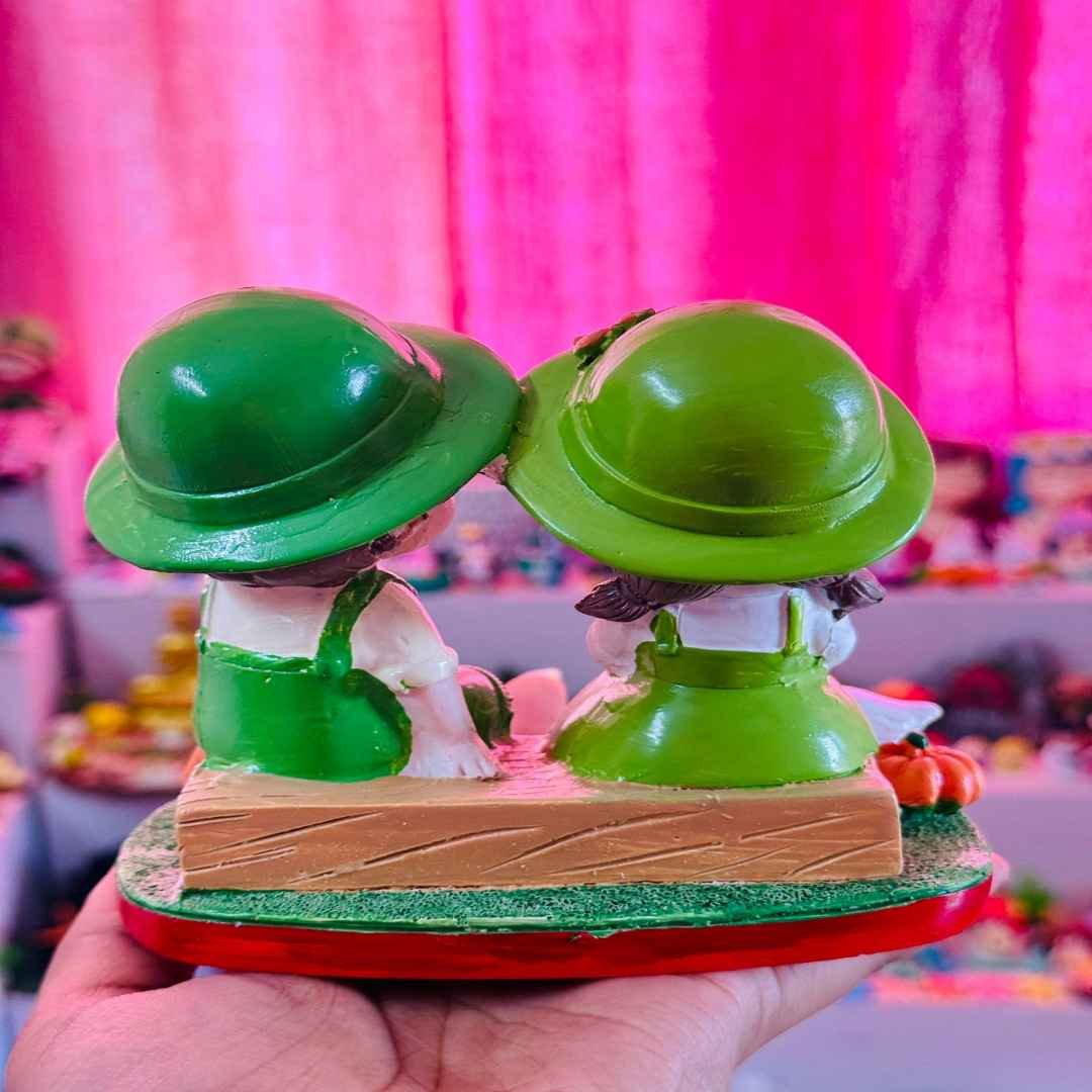 This delightful farming couple figurine features a vibrant green cap design and a heartwarming duck-feeding scene. Crafted from premium imported stone dust, the 4.5”+ miniature showcases a boy and girl seated on a textured base, feeding a white duck and two yellow ducklings. With cheerful expressions and detailed accessories like baskets and pumpkins, this piece adds charm and warmth to any space. Ideal for gifting or enhancing your home décor with a touch of countryside innocence.